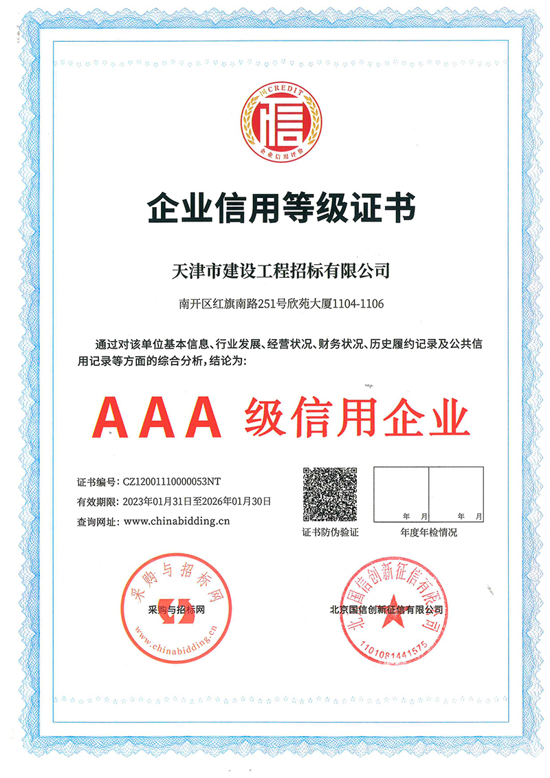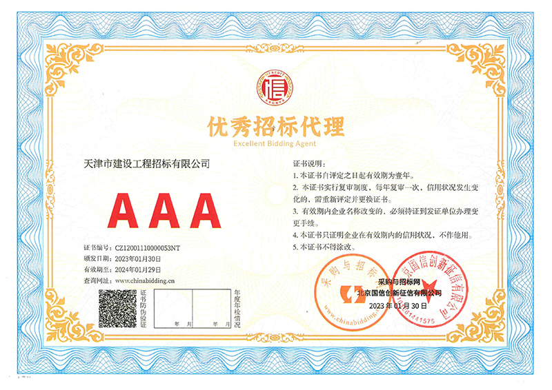 近日,從天咨公司下屬招標公司傳來喜訊,招標公司在采購與招標網(wǎng)以及北京國信創(chuàng)新征信有限公司聯(lián)合組織的企業(yè)信用等級等有關(guān)評選中,獲評3A級信用企業(yè)和3A級優(yōu)秀招標代理企業(yè)。