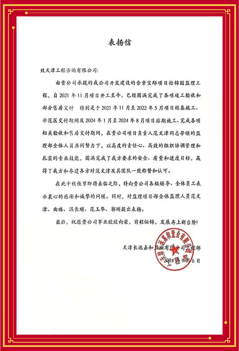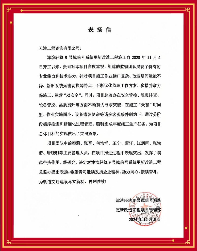 津濱輕軌9號線信號系統(tǒng)更新改造工程項目部感謝監(jiān)理團隊多舉措解決項目施工作業(yè)接口復(fù)雜、改造期間運能不降、新舊系統(tǒng)無縫切換等難題,力保施工、運營“雙安全”;天津長遠嘉和置業(yè)有限公司贊賞含璋寶坻項目怡錦園項目監(jiān)理團隊以高度的責任心、高效的組織協(xié)調(diào)管理和扎實的專業(yè)技能推動項目圓滿完成;天津華勘穂金房地產(chǎn)開發(fā)有限公司感謝監(jiān)理項目部主動對接業(yè)主需求,有效管控質(zhì)量安全,切實保障施工進度,很好地履行監(jiān)理職責......