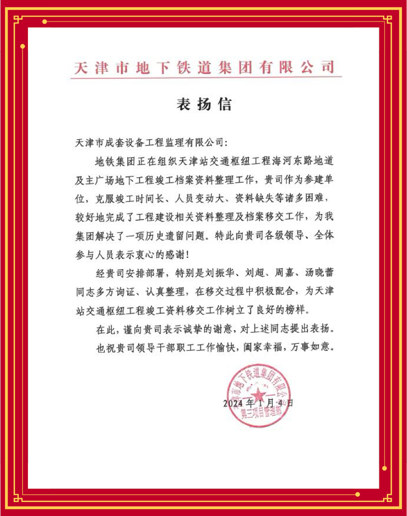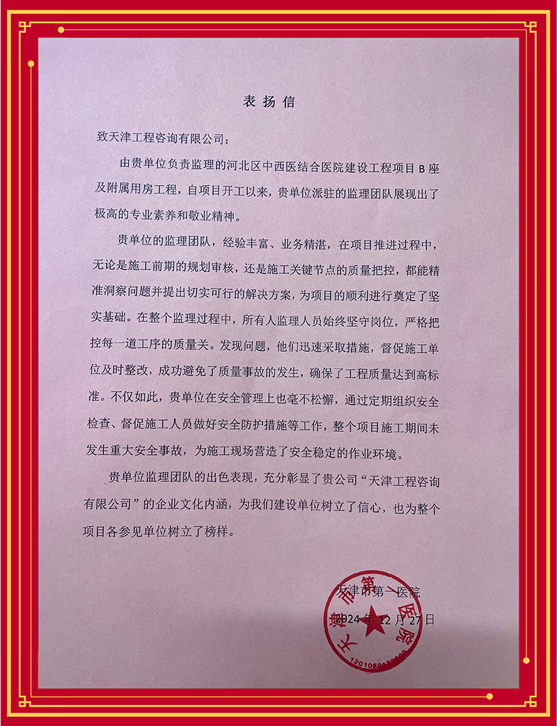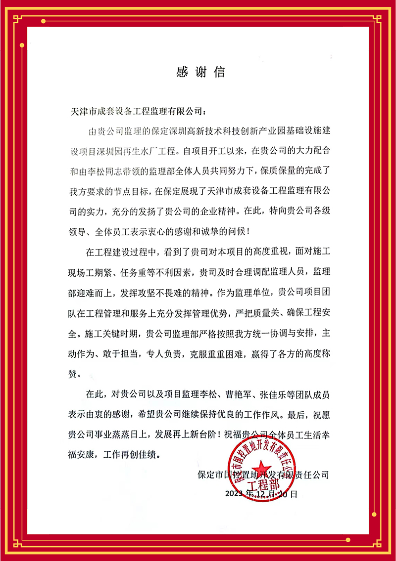 2024年,為持續(xù)深化“1264”戰(zhàn)略體系特別是“六化”舉措,加快推進實體化進程,天津咨詢順利完成吸收合并下屬成套監(jiān)理公司,在持續(xù)打造天津咨詢品牌,以工程監(jiān)理和項目管理為基礎(chǔ),發(fā)揮在項目建設(shè)期的綜合專業(yè)優(yōu)勢,逐步形成“監(jiān)”“管”一體化服務(wù)模式方面邁出關(guān)鍵一步。近期,多家業(yè)主單位先后發(fā)來感謝信、表揚信,對天津咨詢承擔工程建設(shè)監(jiān)理任務(wù)給予充分肯定。