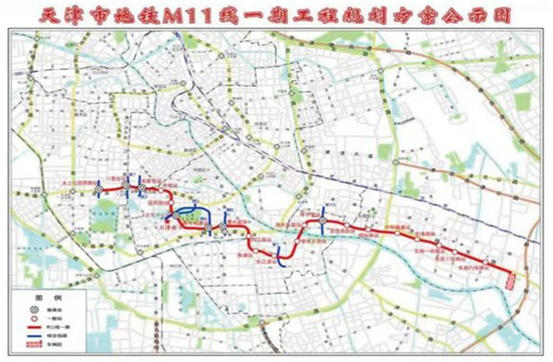 天津地鐵11號線一期工程線路全長22.6公里,共設21座車站,均為地下站。在東麗區(qū)設置七經(jīng)路定修段一座。本工程設有兩座主變電所,新建六里臺主所1座與7號線共享,新建馴海路主所1座,與Z1線共享,正線設置牽引變電所11座,定修段獨立設置 1座牽引變電所??刂浦行囊惶?,設置在華苑車輛段內(nèi),另外在七經(jīng)路定修段設備用控制中心一處。概算總投資256.02億元。