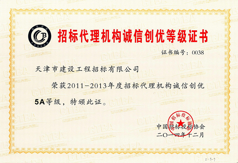 2011-2013年度招標代理機構誠信創(chuàng)優(yōu)5A等級