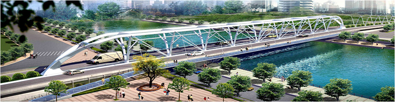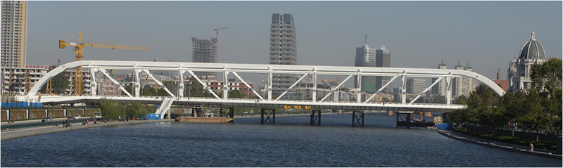 該橋橫跨張自忠路、海河以及海河?xùn)|路。橋梁總長180米,主跨128米,面積4985.2 平米,為自錨式桁吊組合鋼結(jié)構(gòu)橋。總投資2.65億元。該橋梁設(shè)計在國內(nèi)外尚屬首創(chuàng)。