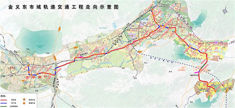 項(xiàng)目建設(shè)規(guī)模由金華—義烏和義烏—東陽兩條線路組成,兩線在秦塘站呈雙島四線同站臺(tái)換乘。其中,金華—義烏線起于金華火車站,沿雙龍街-李漁路-李漁東路-站前路-金義新區(qū)新城路-規(guī)劃國貿(mào)大道二期-國貿(mào)大道一期,止于義烏秦塘站;義烏—東陽線起于義烏火車站,沿宗澤路-國貿(mào)大道-商城大道-陽光大道-世茂大道-興平路-迎賓大道-S218-鎮(zhèn)北路-萬盛北街-橫店環(huán)城東路,止于橫店客運(yùn)中心。兩條線路總計(jì)全長約107.18公里,共設(shè)站31座(其中地下站13座,高架站18座),設(shè)一段三場(chǎng),建設(shè)地址位于金華地區(qū)(含金華市婺城區(qū)、金東區(qū)、義烏市、東陽市),計(jì)劃于2021年建成。